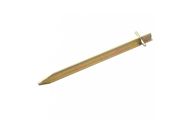 Der Zeltanker für sturmsichere Verspannung. Robust und stabil. Auch mit Eisenhammer einzuschlagen. Aus T-Stahlprofil. Breite ca. 20mm, goldfarben passiviert.