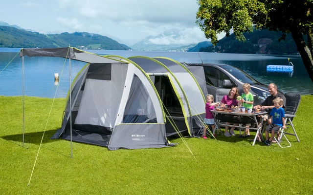 Das Berger Touring Busvorzelt eignet sich für Fahrzeuge mit einer Regenrinnenhöhe von 180 – 220 cm. Die Gesamthöhe des Zeltes beträgt 205 cm.