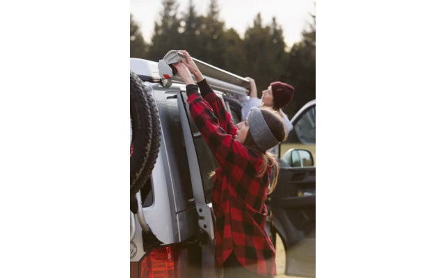 Die praktische, manuell zu tätigende Markise mit integrierten Stützfüßen in der Walze, welche dank der verschiedenen Halterungen (bitte dazu bestellen, siehe Zubehör) an die Fahrzeugwand, Dachträger oder Schiene jeglicher Minivans angebracht werden kann.