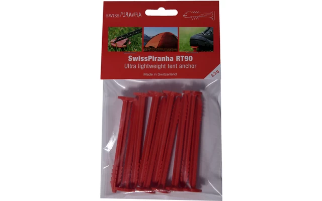 Mit 3,2g und einer Länge von 9cm ist der SwissPiranha RT90 die leichteste Version unseres beliebten RT150 Zeltherings – und somit der leichteste, voll funktionsfähige Hering auf dem Markt. Dieser Hering macht jedes Ultraleichtgewichtszelt zu dem, was es sein soll: ABSOLUT ultraleicht!